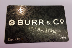 After speaking to ourselves we thought a steel card in a black matt finish with laser etching with a spot UV would strike the right balance with their image and clientele and we could do one side for Burr & Co and the other side for De Vere.